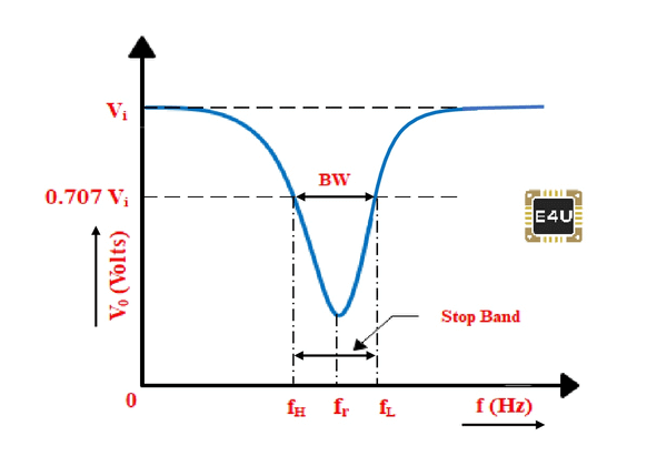 The shunt element of an RLC notch filter is a series combination of L and C. The output is taken across this series combination of inductor and capacitor. The equivalent circuit and characteristics of the RLC notch filter are shown in the figure below.