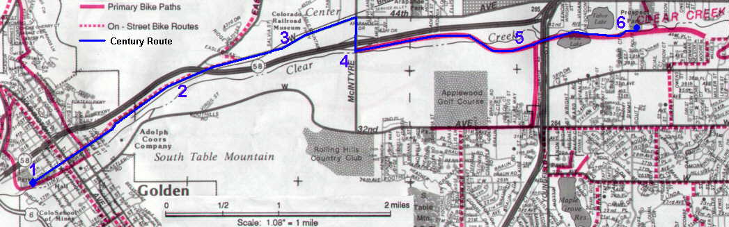 Continuing East we pass the Colorado Railroad Museum which has a Round House and Antique Turntable. Make sure you notice this lovely outdoor museum. Just past the RR Museum, there is another RR crossing. This one has a bicycle diversion path (in each direction) which allows you to have a 90 degree crossing. Please slow down and use this safety route. It will be swept clean for the century.