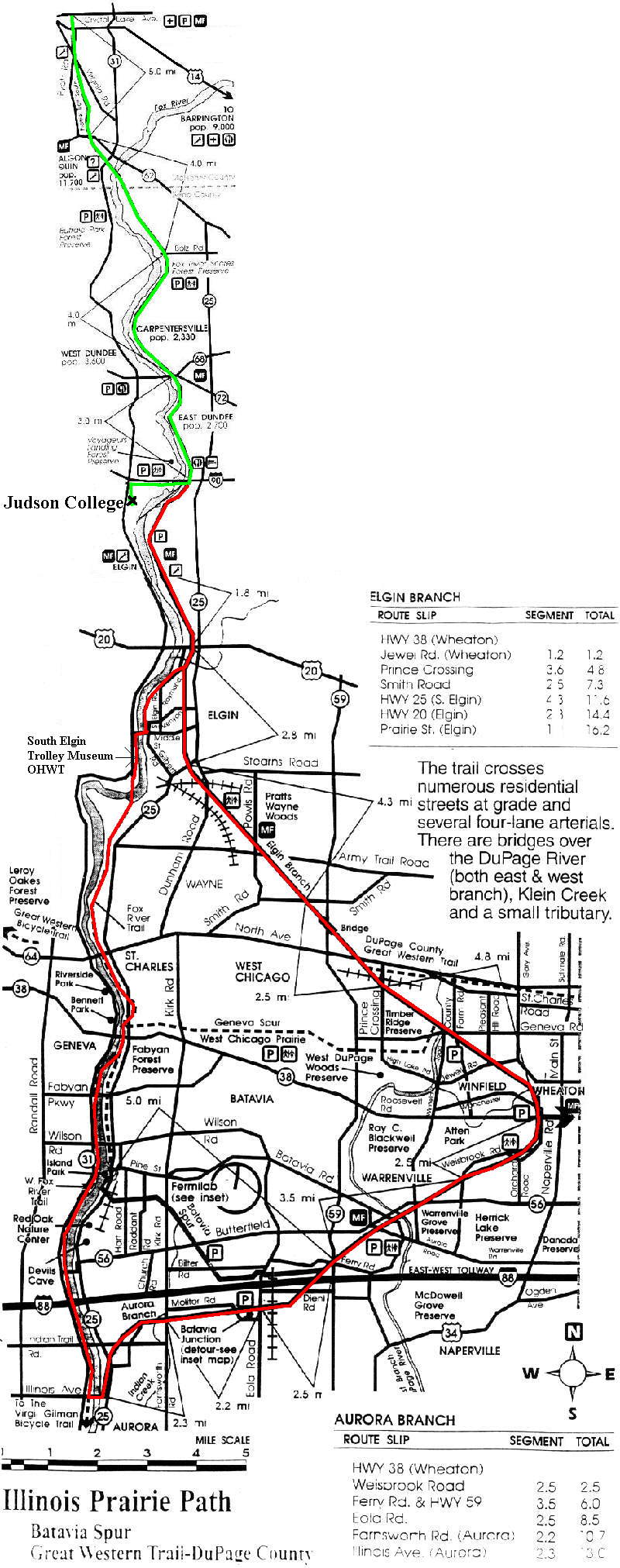- Fox River trail South through Elgin to Illinois Prairie Path.